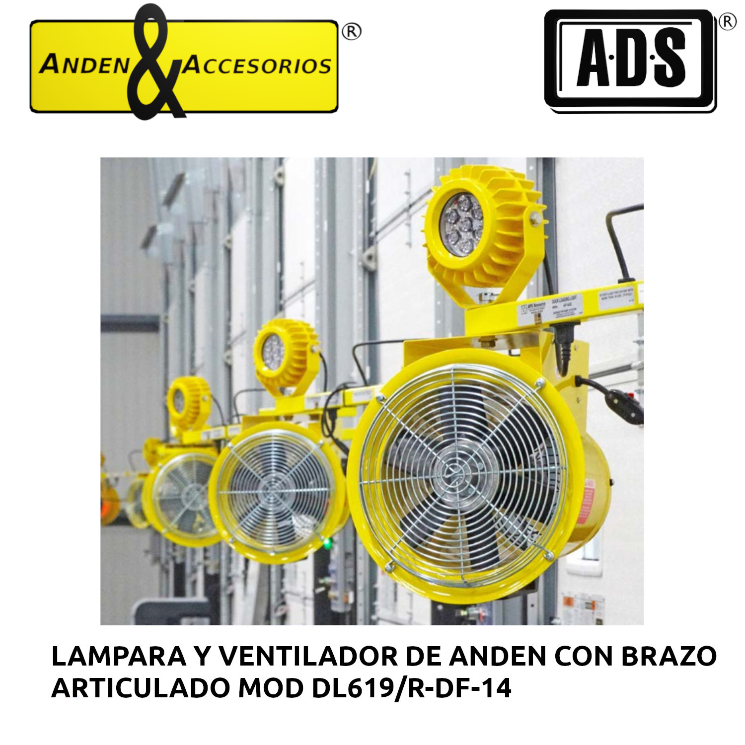 »LAMPARA Y VENTILADOR DE ANDEN CON BRAZO ARTICULADO MOD DL619/R-DF-14 MARCA ADS